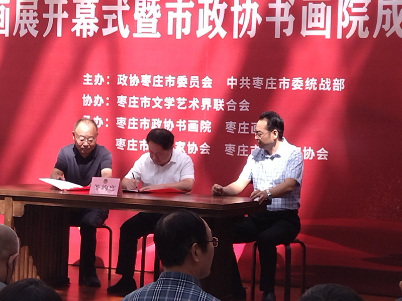 棗莊市政協(xié)主席張兵,山東省政協(xié)辦公廳一級巡視員薛相銳出席并為棗莊市政協(xié)書畫院揭牌。山東省著名書畫家張志民、張望、孟鴻聲、張宜、王居明,棗莊市領(lǐng)導(dǎo)孫恒、張德琦、張學(xué)功、劉宗國、王凌、任怡春、趙作亮,棗莊市直有關(guān)部門負(fù)責(zé)同志和部分藝術(shù)家代表參加活動。棗莊市政協(xié)副主席曹力主持活動。開幕式上聽取了棗莊市政協(xié)書畫院籌備工作情況介紹,宣讀了棗莊市政協(xié)書畫院組成人員名單,為棗莊市政協(xié)書畫院院長張星斗頒發(fā)了聘書,舉行了“畫里棗莊”美術(shù)創(chuàng)作工程簽約儀式和藝術(shù)作品捐贈儀式。
